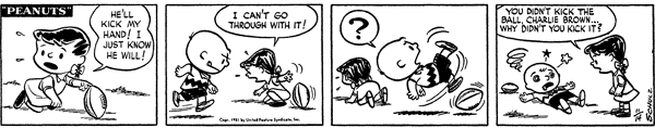 - October 16, 1983 (Lucy holds the ball, but Charlie Brown refuses to kick it; while walking away from her, he suddenly finds Sally, Peppermint Patty, Marcie, Snoopy and Woodstock all holding footballs and daring him to kick them)